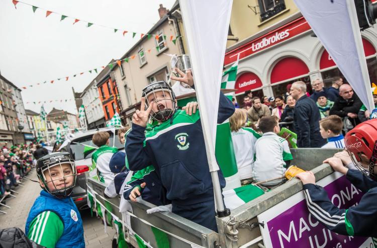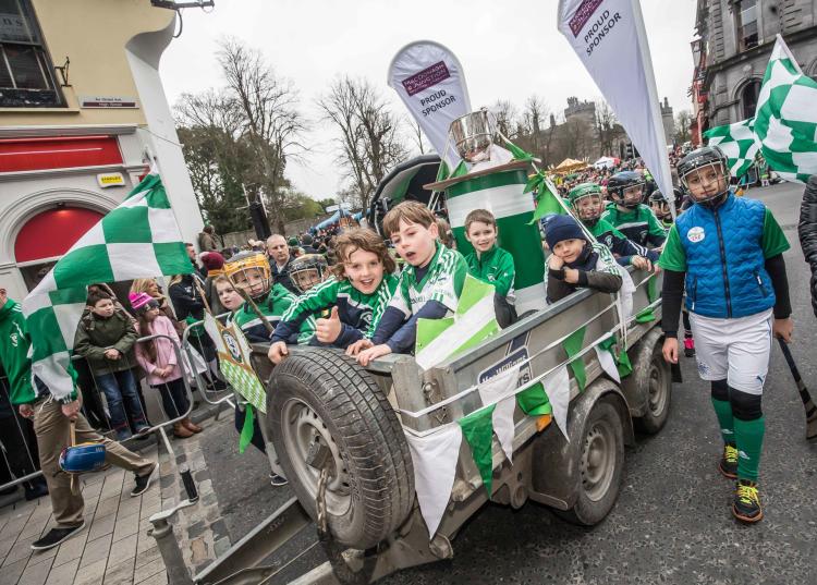 Dicksboro captain, Ollie Walsh, was presented with both trophies in the senior hurling grade, as winners of the League and Championship Kilkenny hurling: Dicksboro had Nowlan Park rocking just like The Boss
