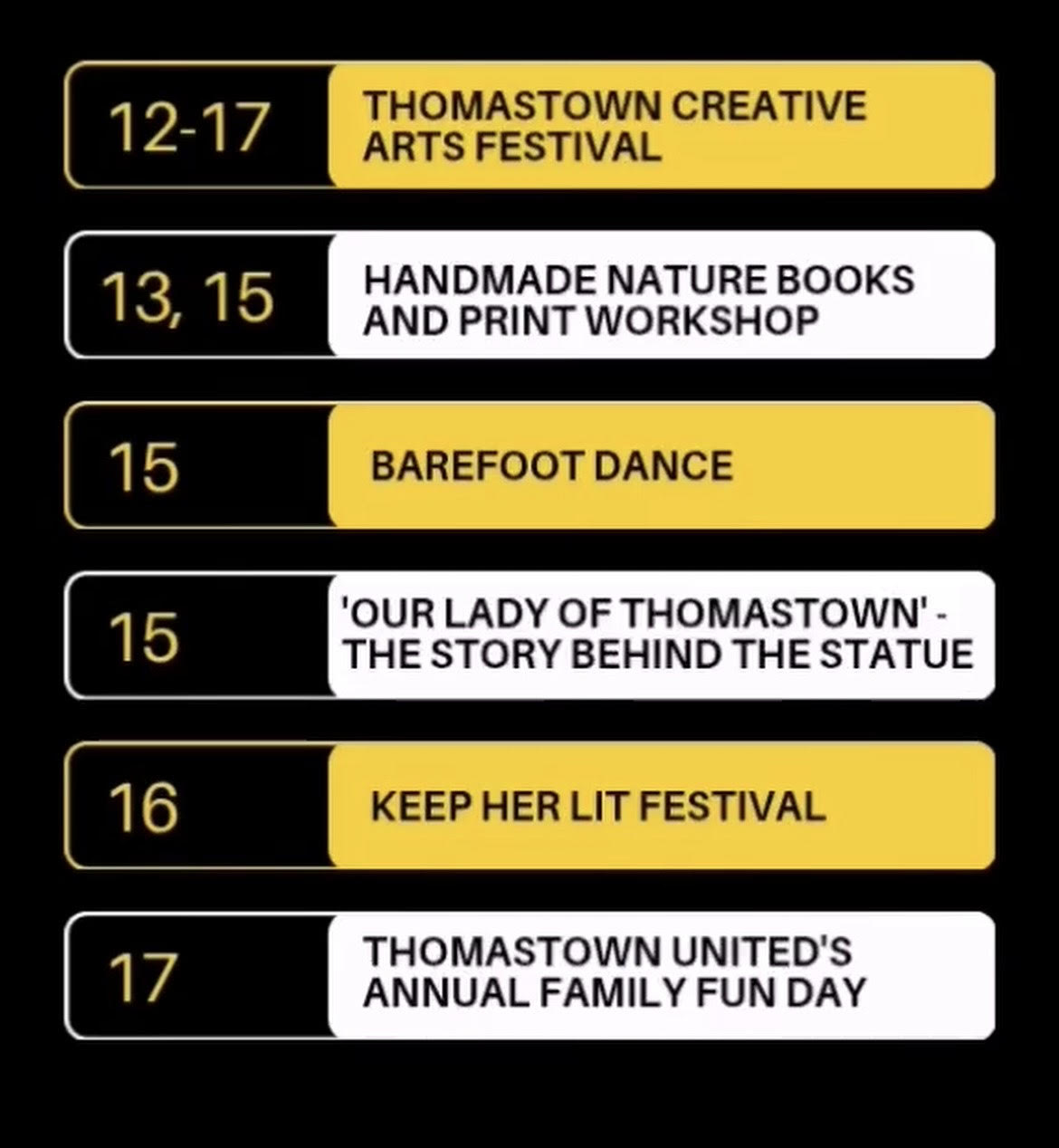 The Thomastown Creative Arts Festival runs concurrently with the Kilkenny Arts Festival. Receiving funding from the Kilkenny Arts Office, it also thrives off of the support from local businesses, community members and it's generous patrons.