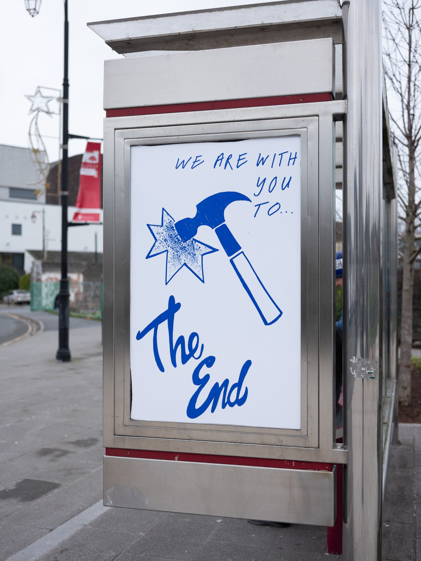 This statement of solidarity is addressed not to Carnegie’s steel workers but to his business manager Henry Frick, encouraging Frick to take the necessary actions to break the union at the Homestead Steel Works Strike in 1892. Displayed here at the bus stop, the words become ambiguous, possibly being reinterpreted as a message of hope and collectivity.