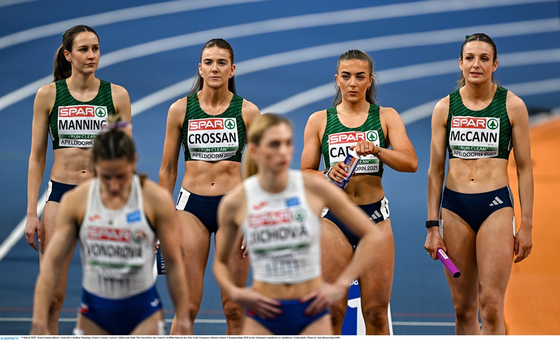 Team Ireland athletes (from left) Cliodhna Manning, Arlene Crossan, Lauren Cadden and Rachel McCann before the women's 4x400m final on day four of the European Athletics Indoor Championships 2025 at the Omnisport Apeldoorn in Apeldoorn, Netherlands PICTURE: Sam Barnes/Sportsfile