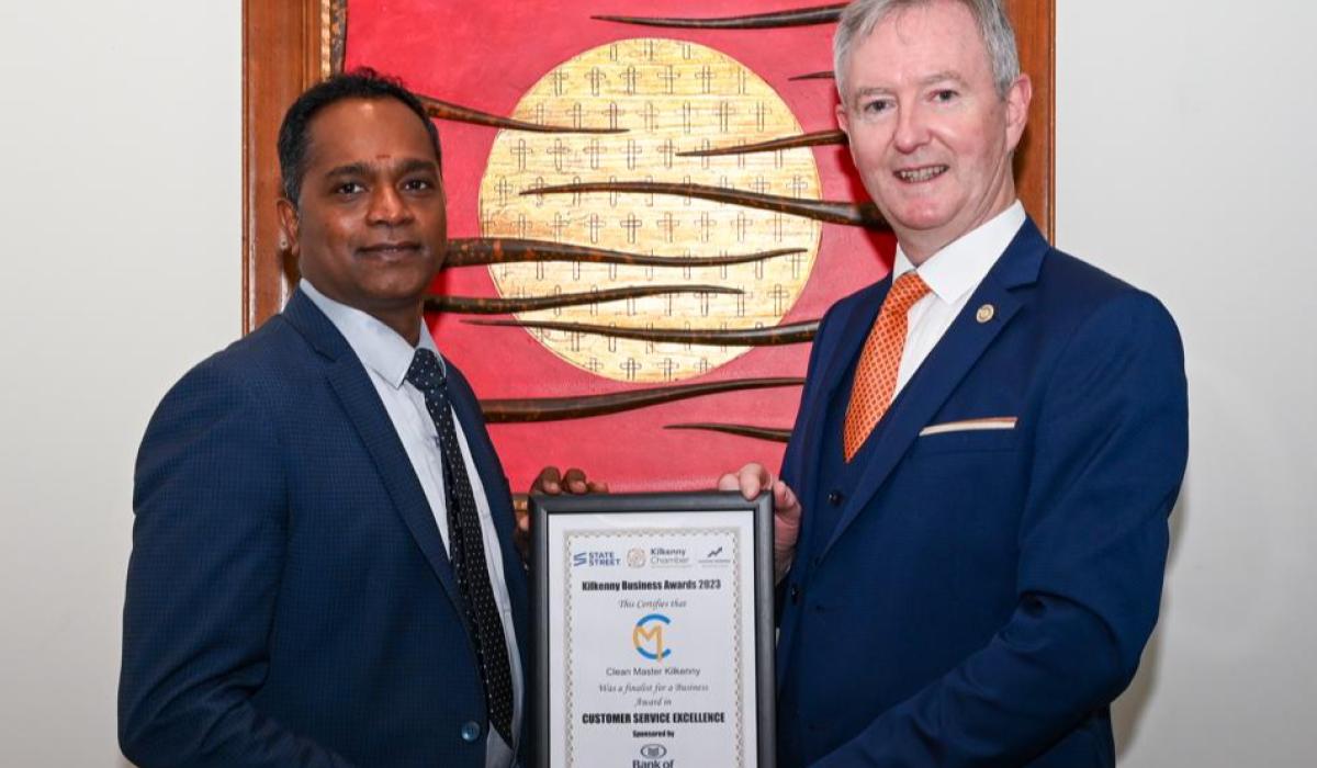 Clean Master Managing Director Murali Dharan receives his award from Kilkenny Chamber CEO John Hurley