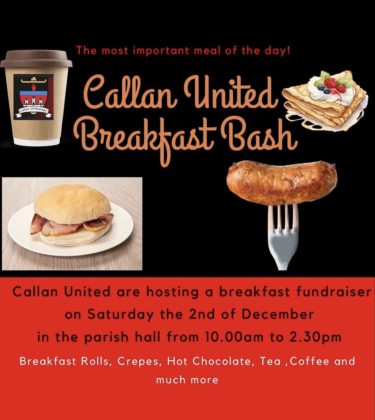 Callan United Soccer Club will host the event this Saturday, December 2, in the parish hall in Callan. From 10am to 2.30pm they'll be dishing up breakfast rolls, crepes, hot chocolate, tea, coffee and more! Support the local club in their efforts and treat yourself to a delicious breakfast!