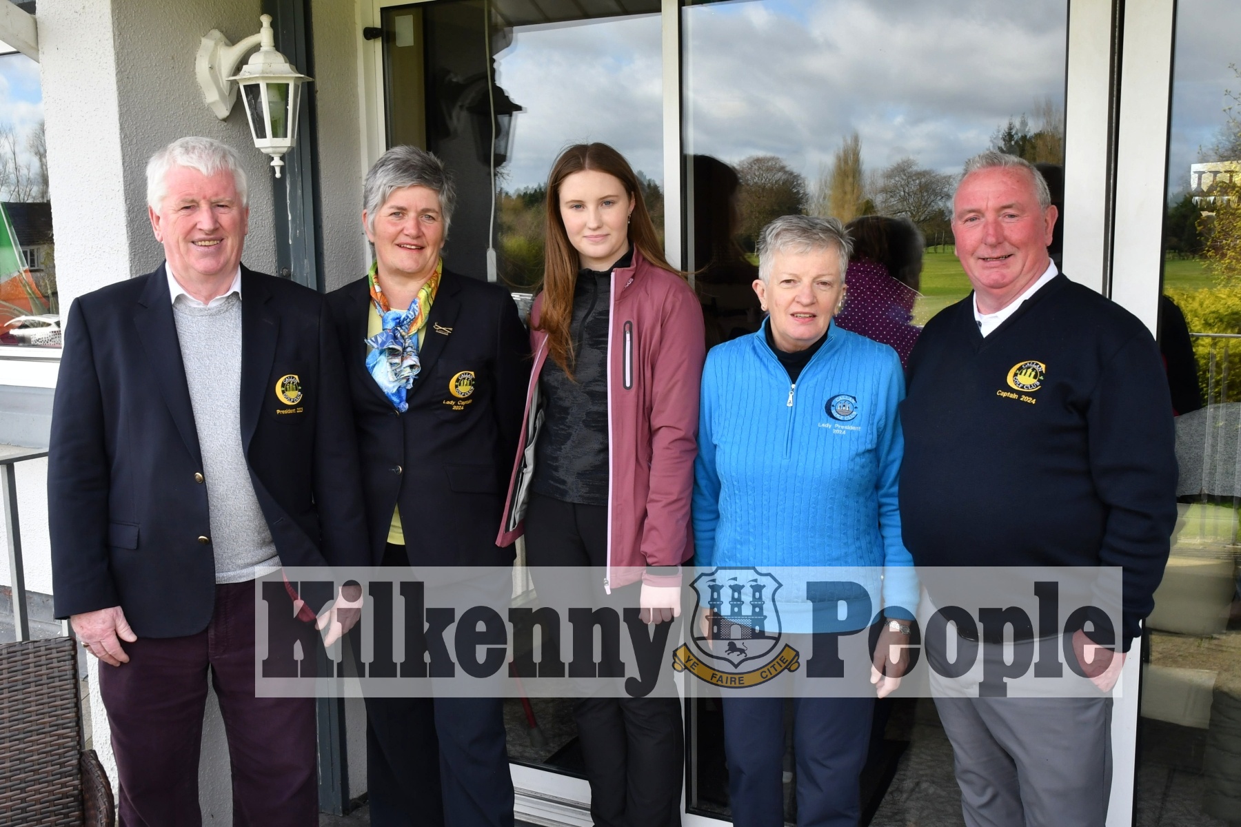 Jim O'Brien, Callan Golf Club President, Bernie Lyons, Lady Captain, Aoife Cunningham, Junior Girls Captain, Rose Brophy, Lady President, and Johnny Kennedy, Mens Captain.