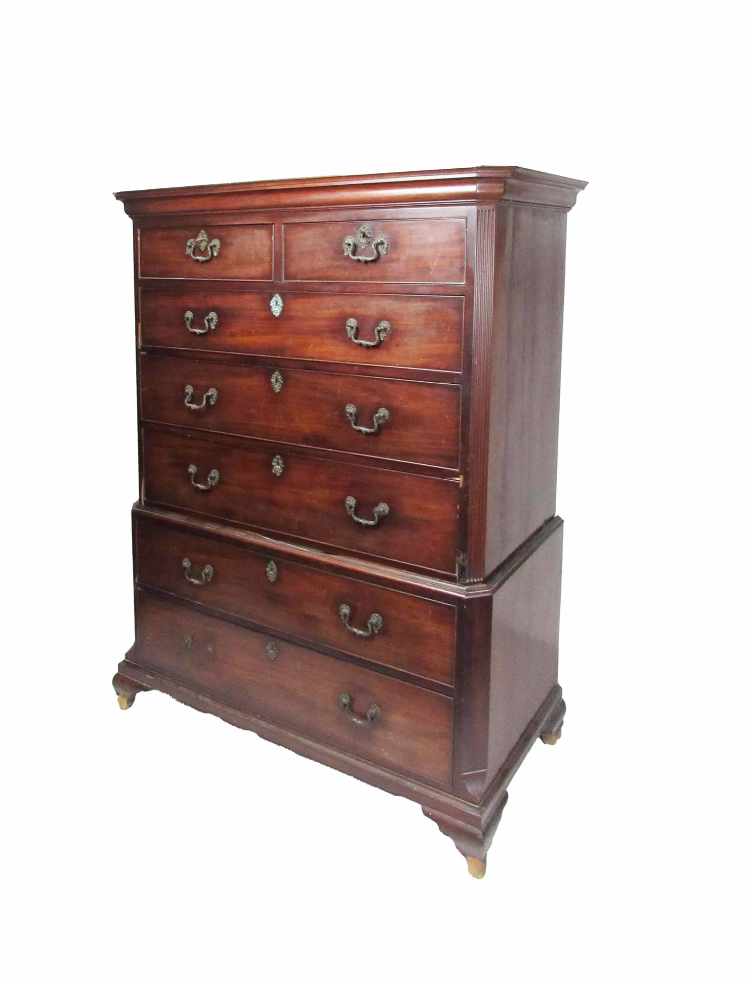 A fine quality Georgian period mahogany chest on chest of low proportions, the moulded cornice above a top section with two short and three long drawers, each with ornate Chippendale type brass escutcheons and drop handle, the side with shaped reeded pillars on conforming base with ogee bracket feet.