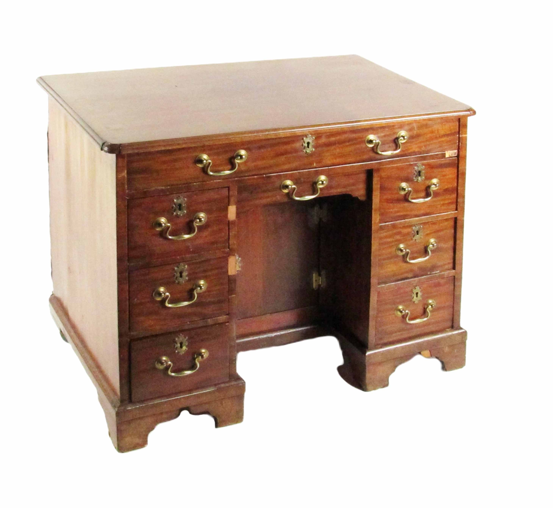 A Georgian period mahogany gentleman's kneehole desk, of rectangular shaped moulded top above a long frieze drawer with brass handles, kneehole compartment flanked either side by three narrow drawers with matching handle, on bracket feet, approx. 84cms wide x 71cms high x 53cms deep.