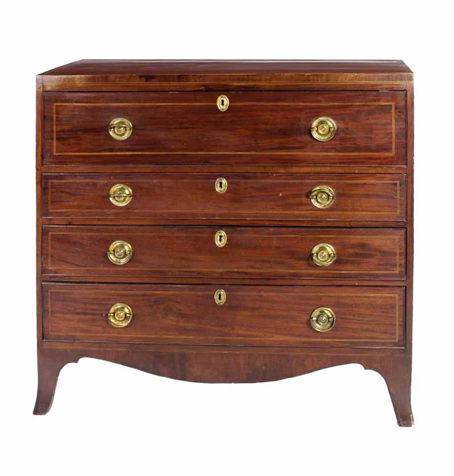 A 19th Century mahogany bureau chest, inlaid and crossbanded top over a pull out section with pigeonholes and shelves, with three further drawers each decorated with string inlaid and brass handles, on out splayed legs, approx. 110cms wide x 104cms high.