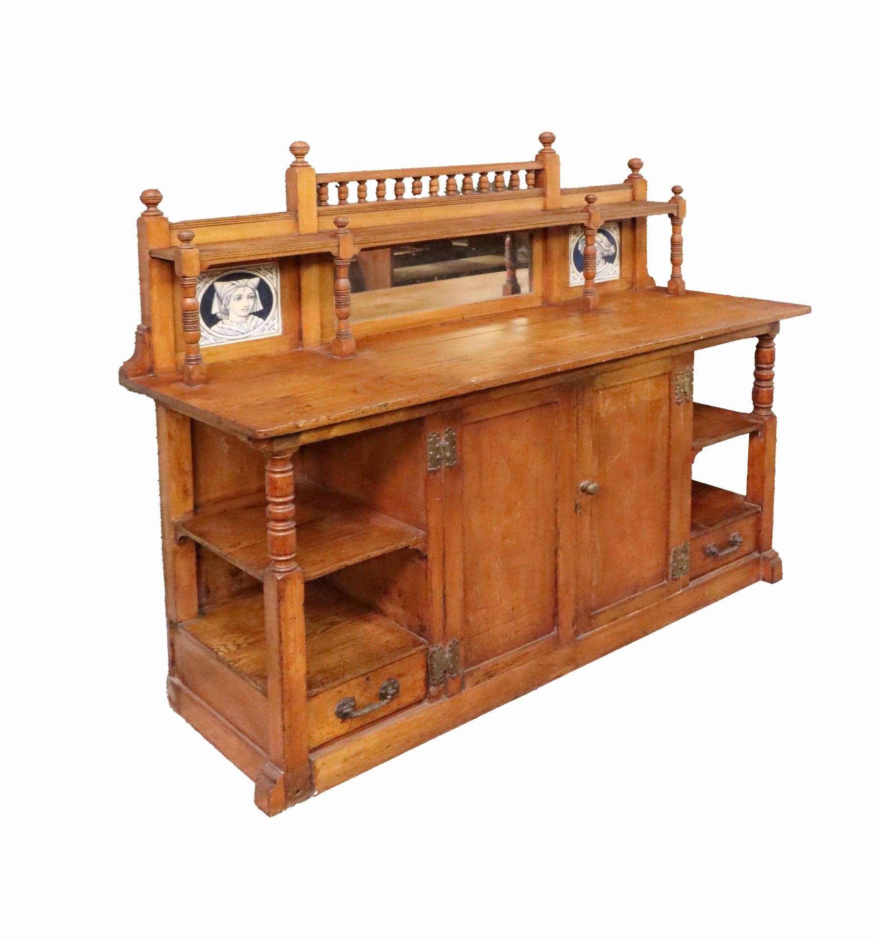An attractive carved and turned oak English arts & crafts period sideboard, possibly by Morris & Co., the shaped turned rail back, inset with mirror and two blue and white porcelain portrait tiles, over two centre doors, flanked either side by open shelves, and two small drawers, on plinth base, with decorated brass hinges and handles.
