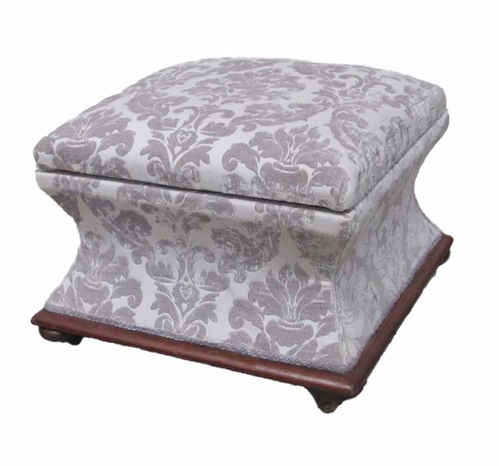 A 19th Century ottoman, the lift top and body covered in pale damask on moulded mahogany base with bun feet.