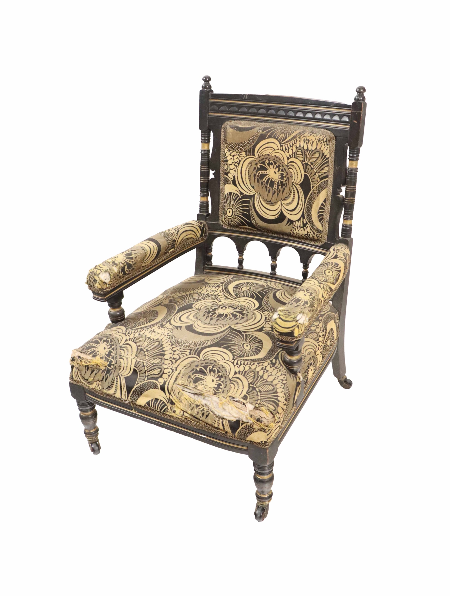 A 19th Century aesthetic movement, ebonised and gilt highlighted open armchair, of low proportions, possibly by Gillows, covered in period fabric, on front turned legs.