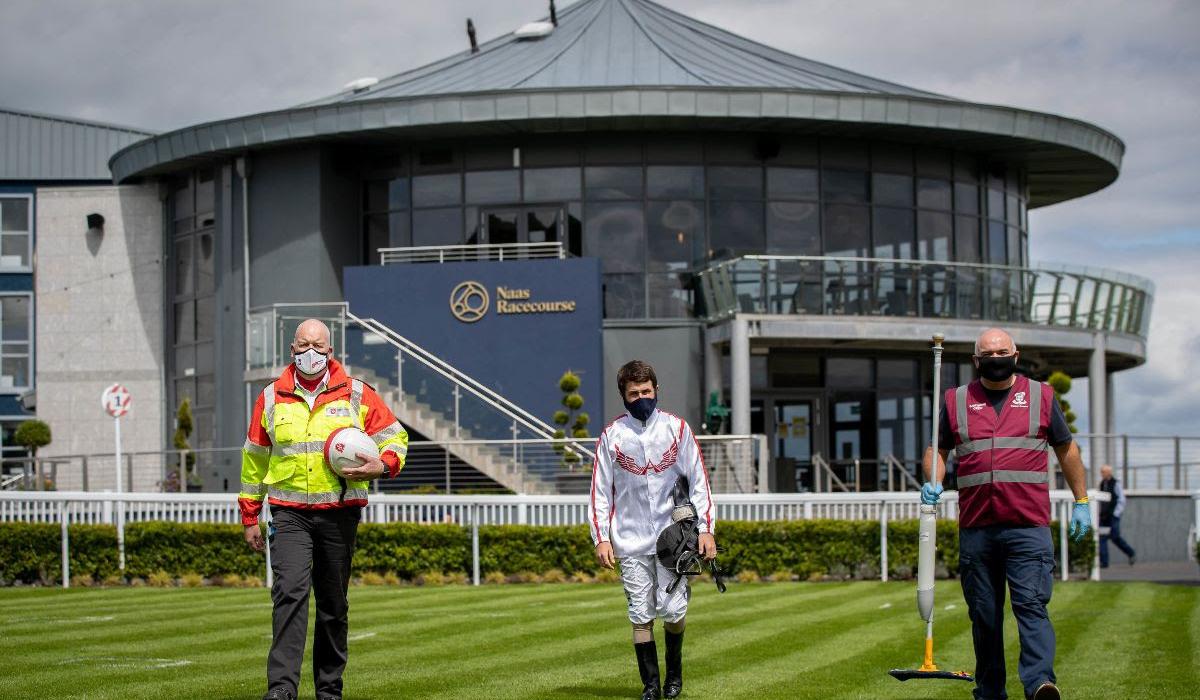 Paul Whiteley, cleaning contractor, Kilkenny jockey Shane Foley and Order of Malta volunteer, Darren Maguire at Naas Racecourse. Picture: ©INPHO/Morgan Treacy.