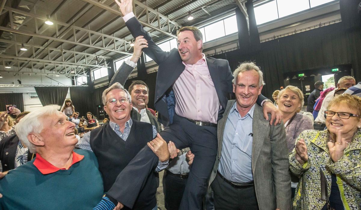 Newly elected Cllr Pat Fitzpatrick is held aloft in celebration by jubilant supporters