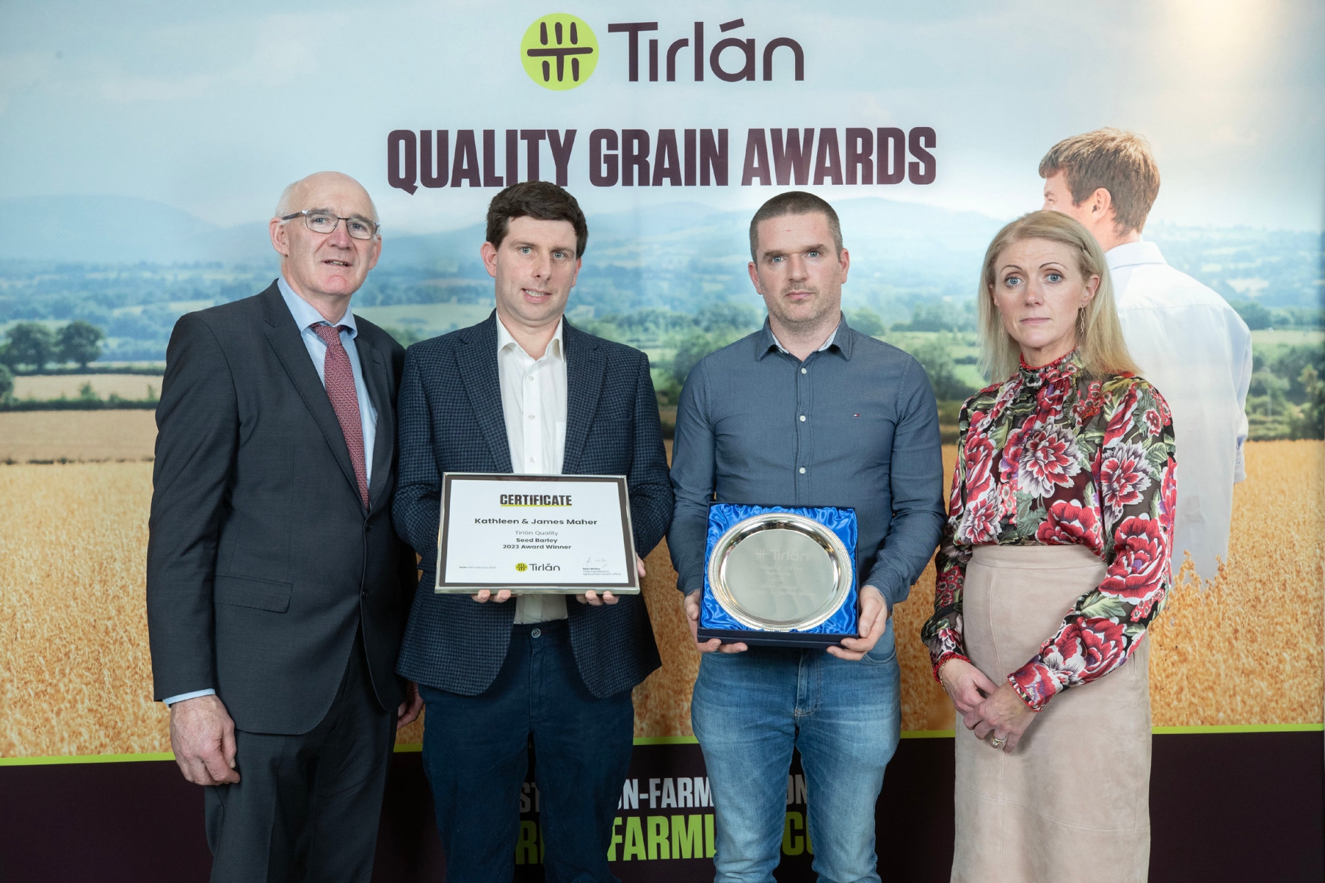 The Tirlán Quality Grain Awards for 2023 celebrated the best of Irish grain with 14 top suppliers commended at the ceremony held in Portlaoise on February 20th, 2024. James and Kathleen Maher from Johnstown, Co Kilkenny received the award for Seed Barley. Pictured (L to R) were Tirlán Vice-Chairperson Pat Murphy, Agronomist Tim Scott, Award-winner James Maher and Tirlán Director of Agribusiness Ailish Byrne. Picture: Finbarr O'Rourke
