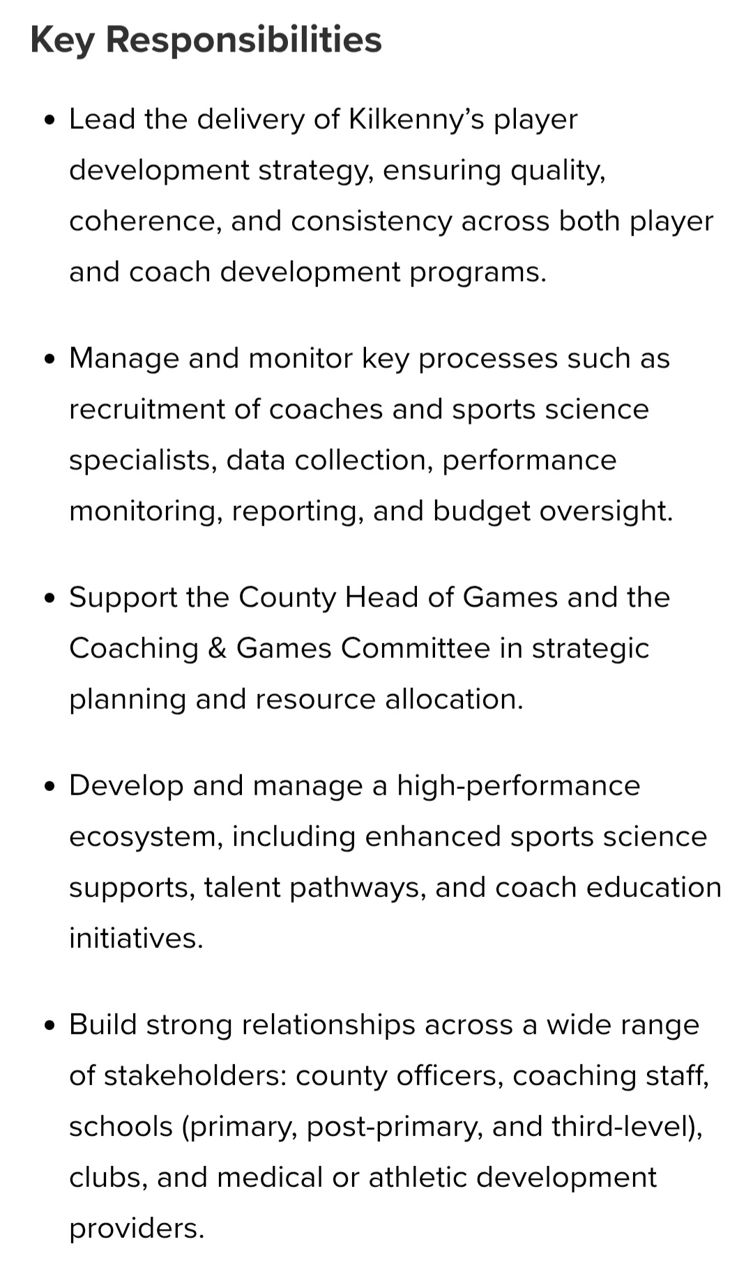 "This position plays a critical role in shaping a robust and sustainable performance environment, bringing together coaching excellence, athlete welfare, and innovation across Kilkenny GAA’s pathways," the job notice read.
