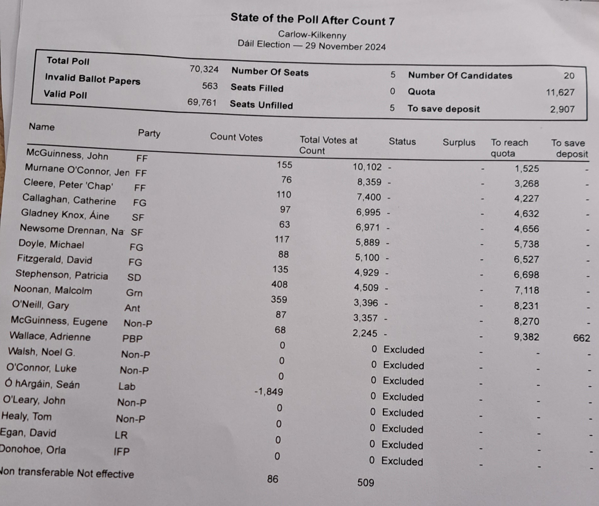 Independent councillor Eugene McGuinness has failed to secure a Dáil seat in his first attempt with his General Election elimination confirmed after count seven at the Kilkenny Count Centre in Loreto secondary school.