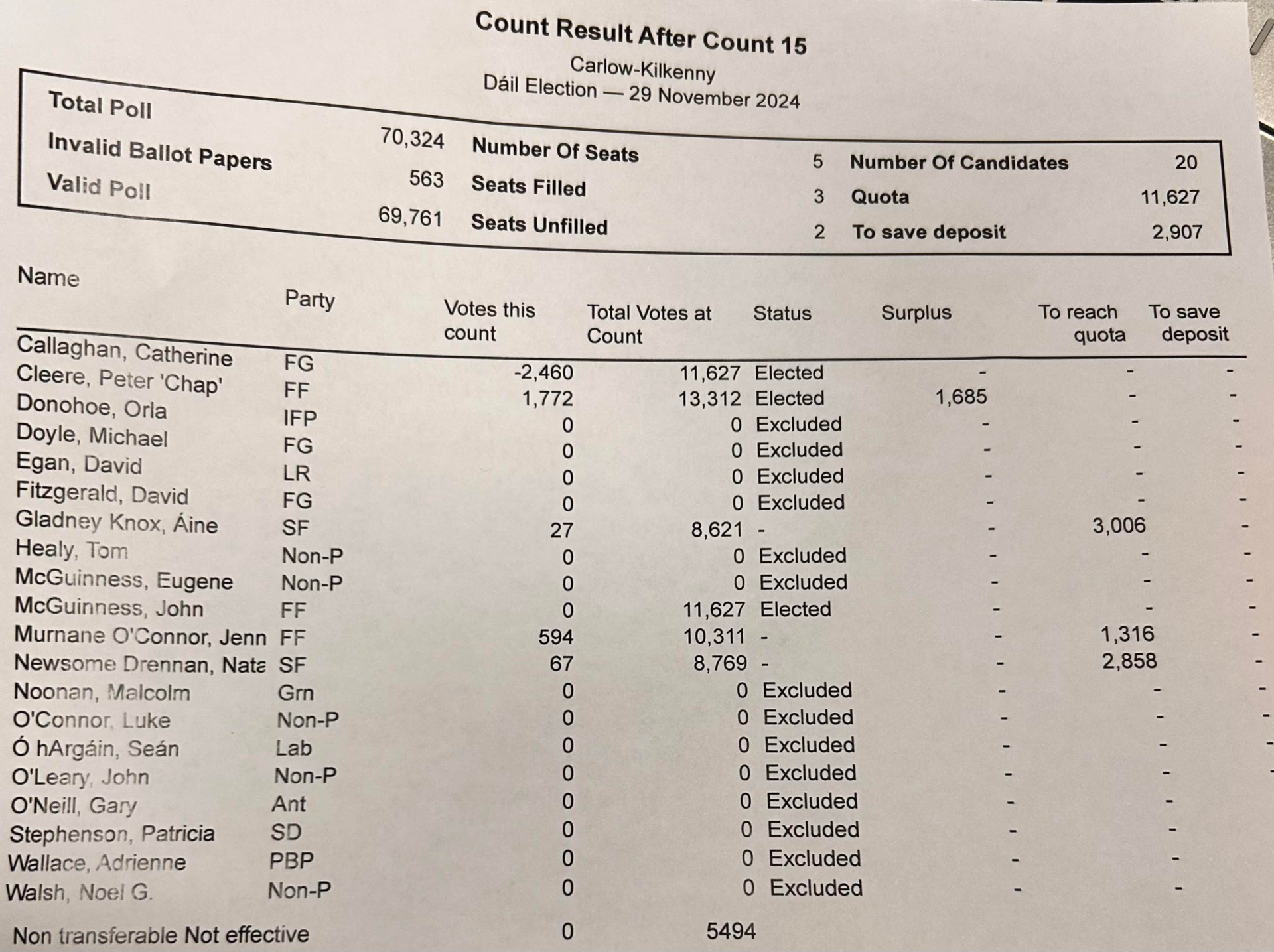Three candidates are now in the battle for the remaining two seats: Jennifer Murnane O'Connor (Fianna Fáil), Áine Gladney Knox (Sinn Féin) and Natasha Newsome Drennan (Sinn Féin).