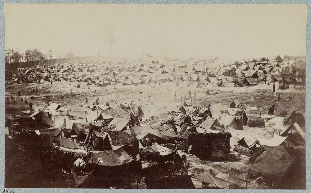 Image: Rows of ramshackle tents in the open-air at Andersonville Prison. Source: Library of Congress