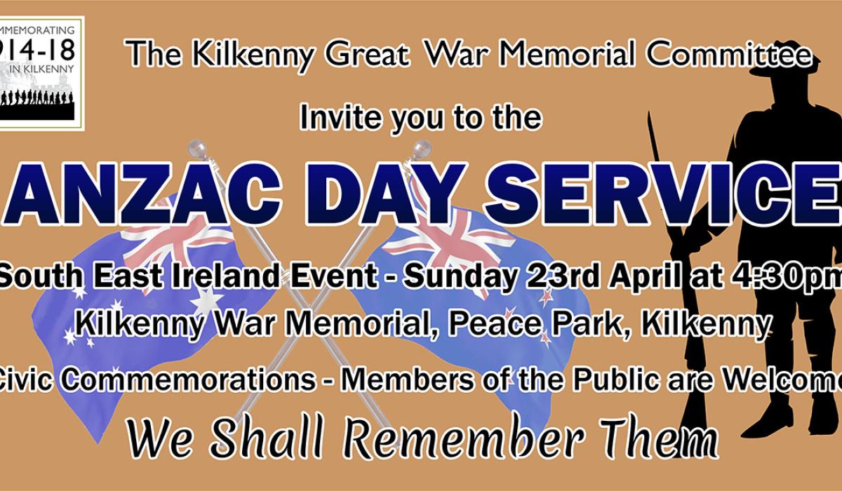 Kilkenny Great War Memorial Committee will hold a commemorative ceremony at the Kilkenny Great War Memorial in the Peace Park, Kilkenny City on Sunday, April 23 at 4.30pm to remember those from the South-East of Ireland who served in the ANZAC Forces in World War I.