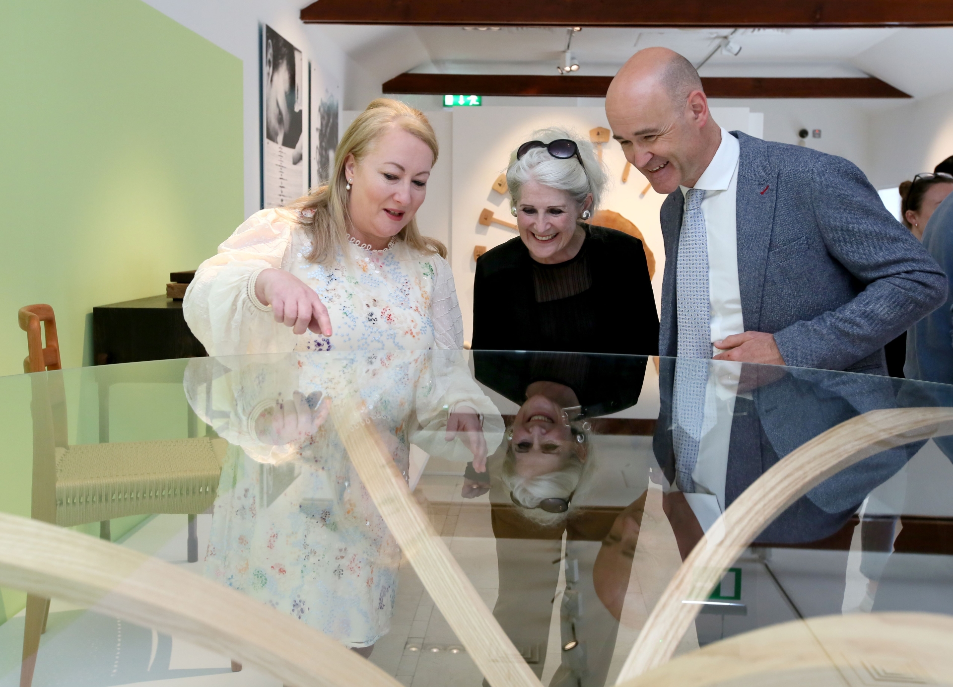 Rosemary Steen, CEO of the Design and Crafts Council of Ireland, who officially launched the exhibition with with Mary Heffernan, General Manager and Creative Leader OPW and ATU Connemara’s Head of Campus, Paul Leamy admiring the table created by Shane Tubrid