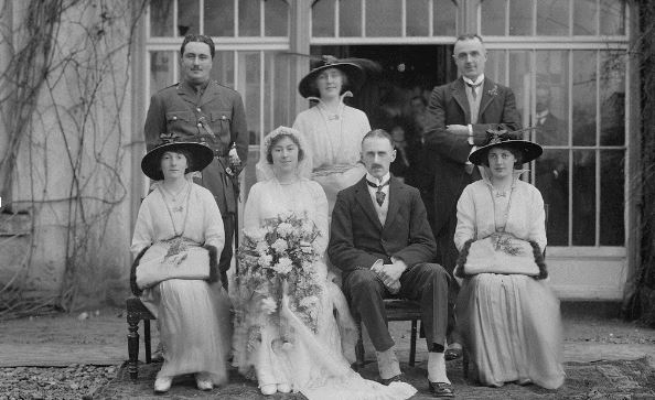 Alice McCreery (25) pictured on her wedding day in 1915 with John Scott Dove (35). The picture is very likely to have been taken at Newpark House, Castlecomer Road which today forms part of Newpark Hotel. Source A H Poole (Waterford) collection. The man in uniform is Mona JN McCreery, Capt, Royal Dublin Fusiliers, son of the late Lt-Col N McCreery, RAMC and of Mm McCreery, Newpark House, Kilkenny. The bridesmaid on our left looks like a McCreery, too, could it be cousin Ernestine (40ish?). The bridesmaid on our right looks like the groom's side of the family. The woman behind must be the mother of the bride, Alice Mary, and the other guy is... the best man