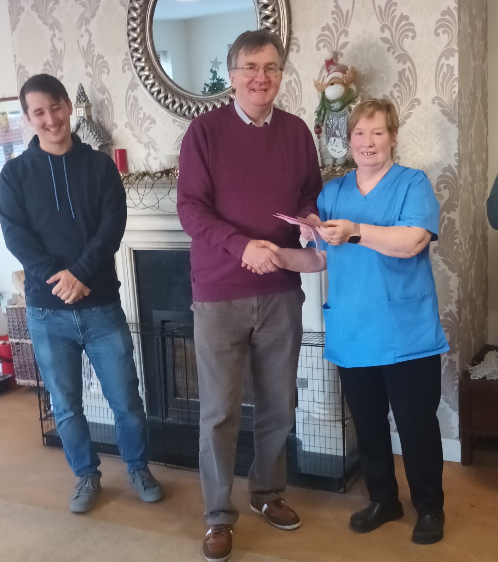 Carol presenting flowers to Connie from the staff the team. Also pictured are Darren (her son) and Noel, Connie's husband