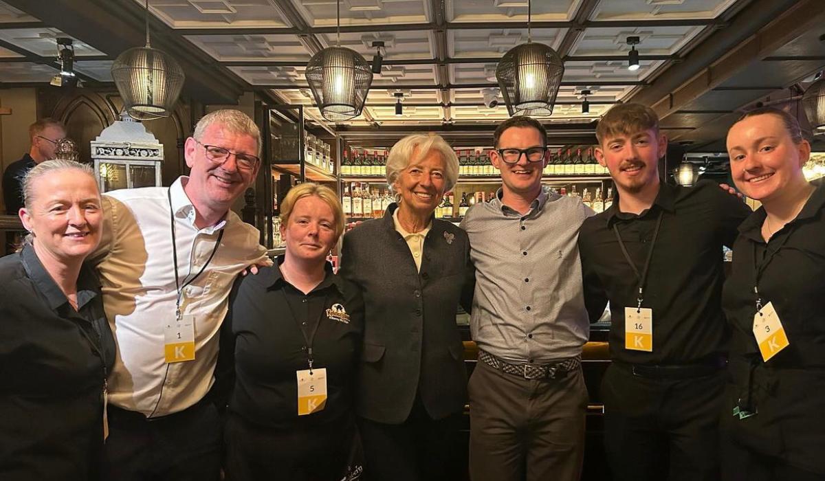 Christine Lagarde, President of the ECB, with staff from Kyteler’s Inn during her visit to the city last week