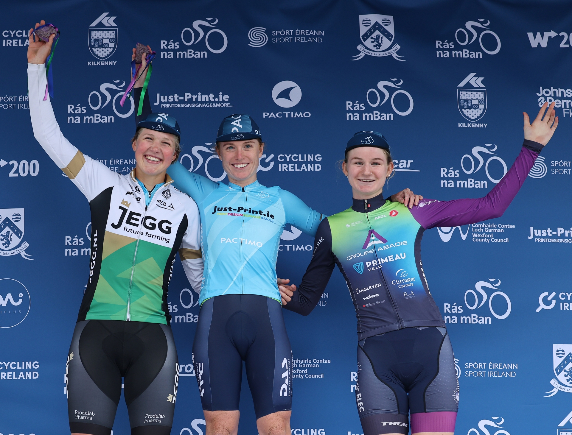 Rás na mBan winner Mia Griffin celebrates with Noor Dekker (second overall, left) and Manon de Boer (third, right) Picture : Lorraine O’Sullivan