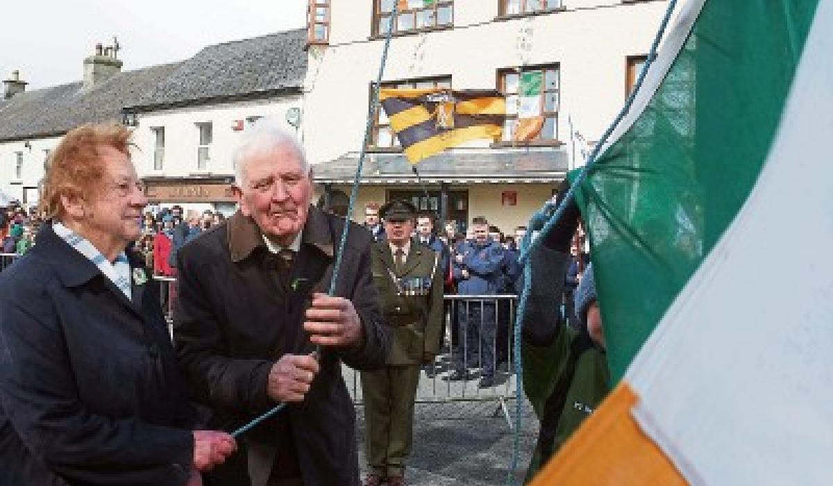 The ceremony ended with the two members of the Defence Force Comm. Noel Maher and Pte John Flynn presenting the Irish Flag to two of our senior citizens Sean Kennedy of Ballylarkin and Kitty Minogue from Threecastles, who had the honour of raising the flag after which all in attendance sang Amhran Na bhFiann.