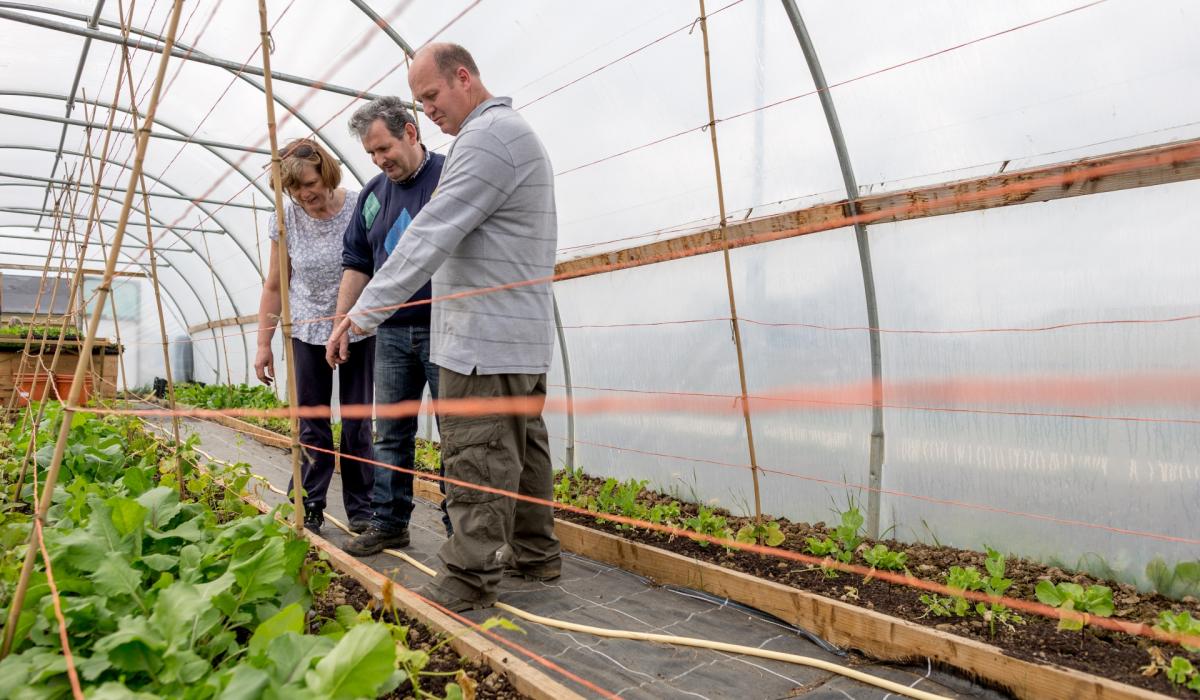 John Kelly, Head Gardener, with volunteers Michael Shanahan and Verena Butler in the School of Food's polytunnel.