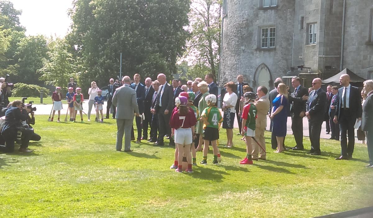 'King' Henry Shefflin gave the Prince of Wales a hurling lesson this morning in the Castle Park, while hurling manager Brian Cody showed him how to hold the hurley.