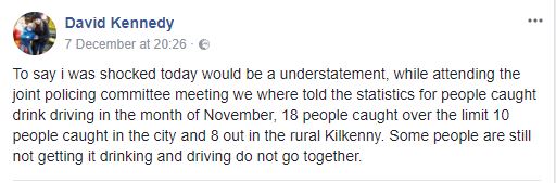 Cllr David Kennedy says it's incredible in this day and age, given the amount of ads, awareness campaigns and the clear regulations, that people are still drinking and driving. He posted about the issue on social media following a recent policing meeting, and told the Kilkenny People the message obviously is still not getting across.