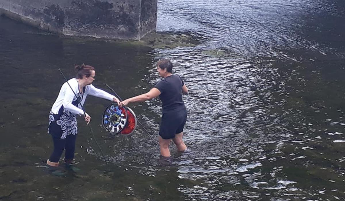 Catherine and Nancy Paton Chair of Thomastown Arts festival taking out the 16 wheels that were thrown into the river. Picture: Breda Gardner