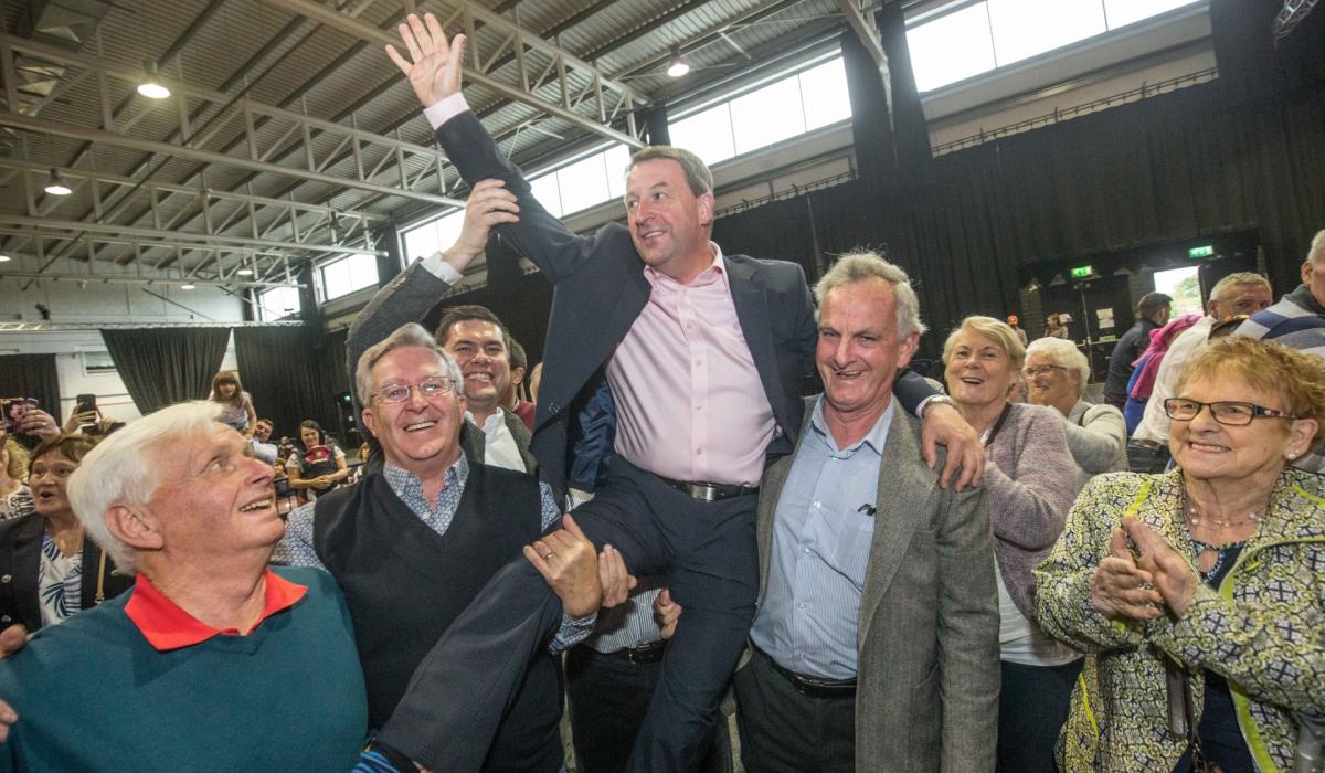 Cllr Pat Fitzpatrick is held aloft at the count following his re-election