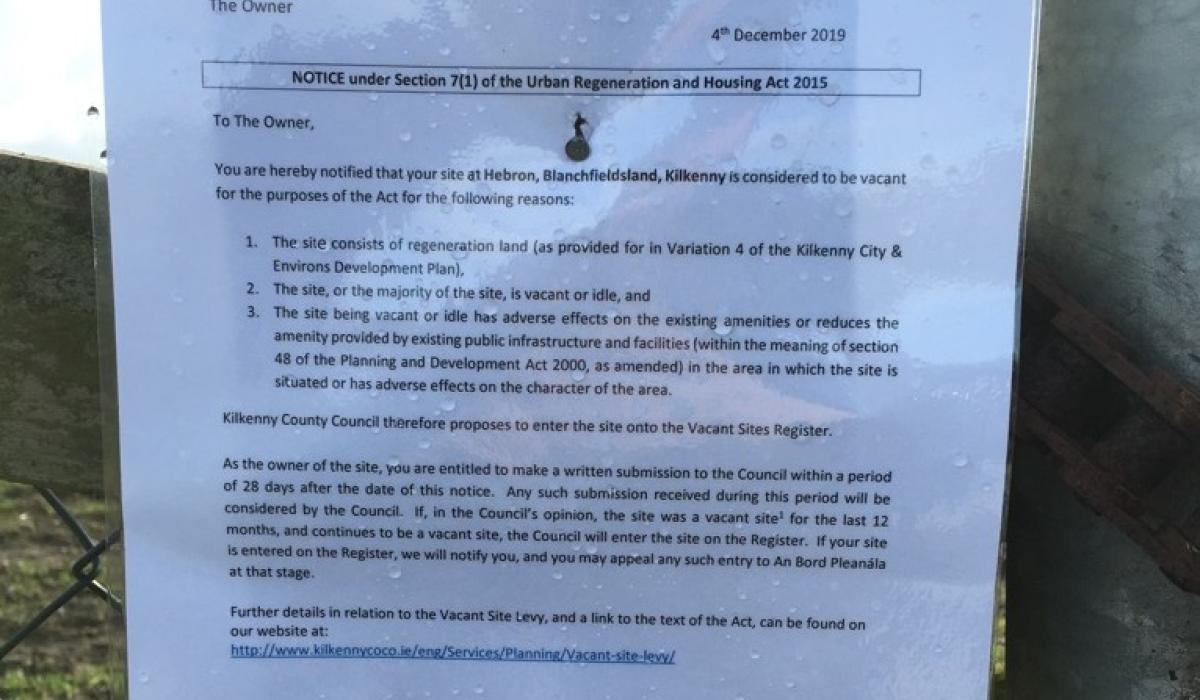 Kilkenny County Council erected a notice at Hebron House, Blanchfieldsland last week. Addressing the owner, it sets out that the site is considered to be vacant under the Urban Regeneration and Housing Act 2015. The owner has 28 days to make a submission to the council, and if the site is then entered onto the Vacant Sites Register, the owner may still appeal this to An Bord Pleanala.