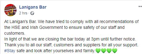 Lanigans in RoseInn Street are closing at 3pm today in the interests of public health and safety.