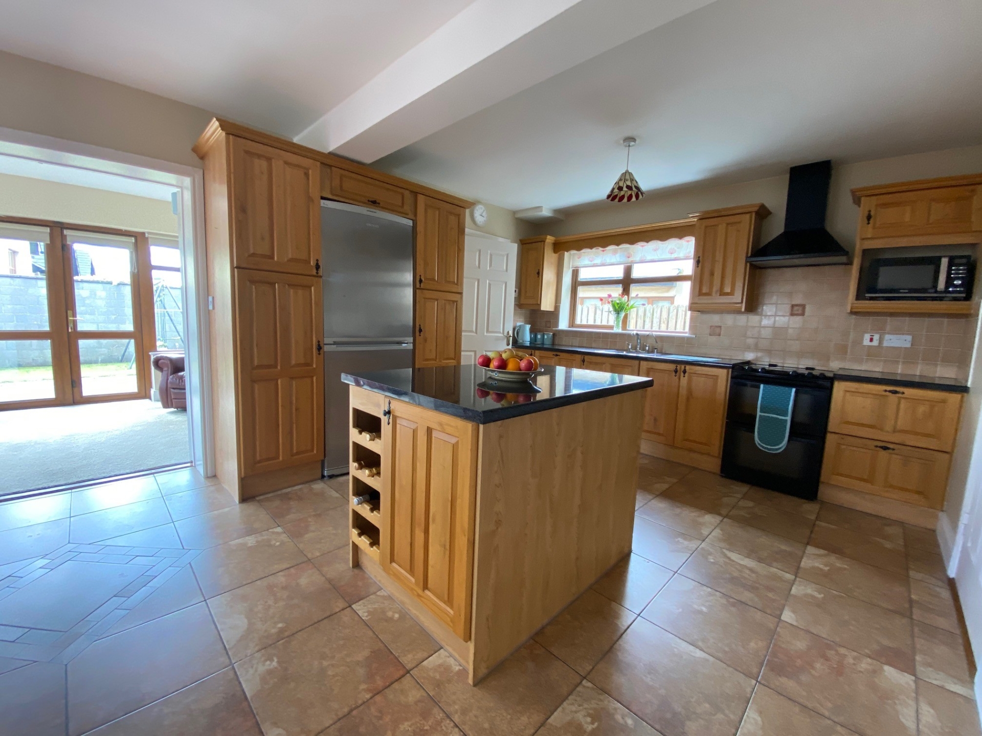 The kitchen/dining room features a traditional kitchen which is in great condition. There is an excellent selection of floor and eye level units with laminate countertop and matching island unit. The kitchen is finished with a tiled floor, with double doors leading out to a sun room.