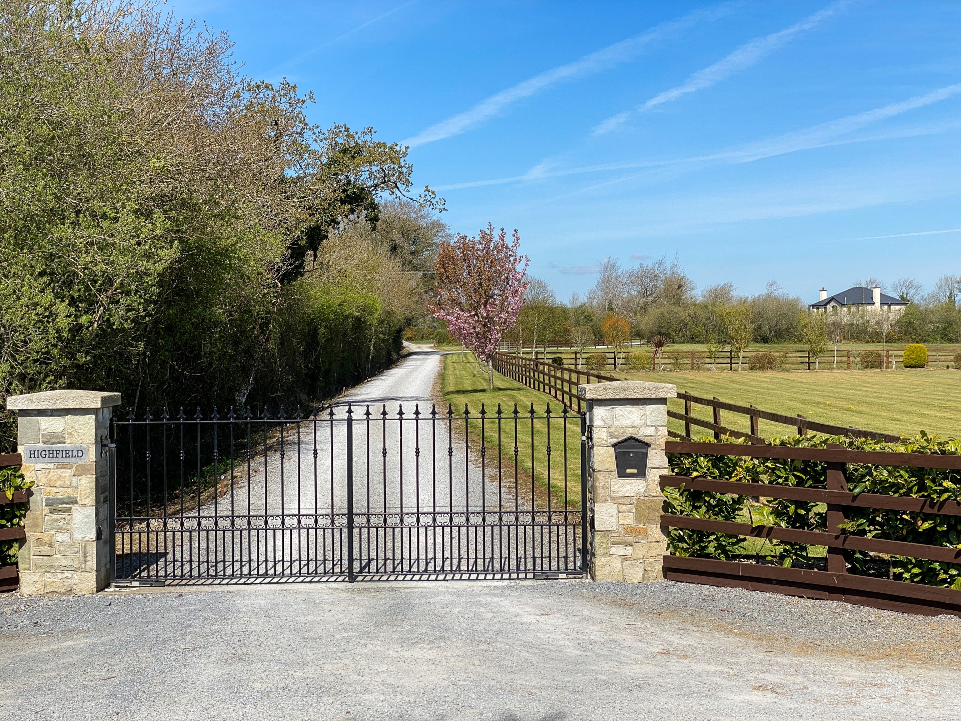 The property is well set back from road and accessed by cut stone entrance piers with electric wrought iron gates. A shared gravelled driveway bounded by a lawn and post and rail fencing leads up to the private entrance for Highfield.