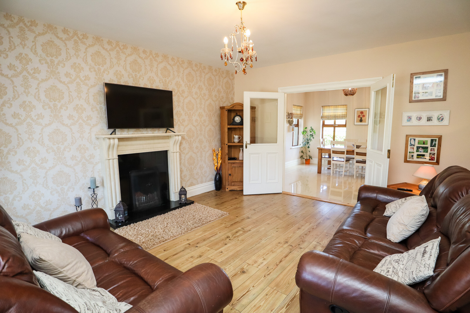 The spacious and light fitted accommodation extends to 218 square metres (2,347 square feet) over two levels. The layout at ground floor comprises: entrance hall, living room, sitting room, sunroom, kitchen/dining room, utility room and a guest wc.