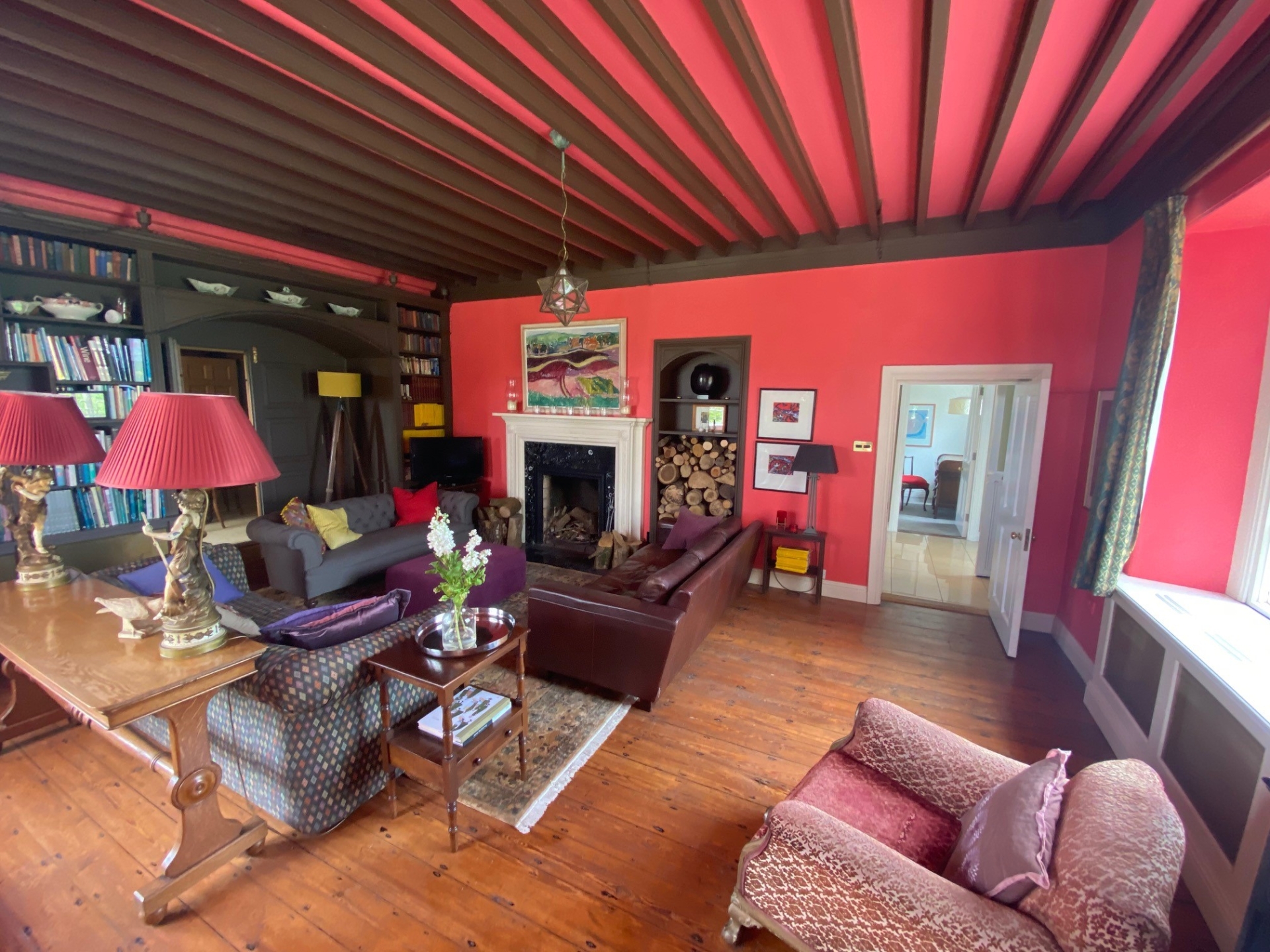 A split level room with original floorboards including an arched features, there are double doors leading to dining room, built in library, large open fireplace. Patio doors to the garden allow for dining options in the beautiful garden area.