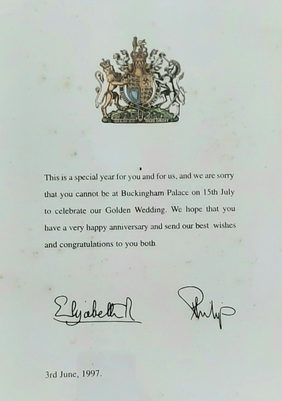 Sadly, Granddad passed away a year later, on their 51st Wedding Anniversary. Nanny at 97 years of age thought of her love every day, especially as she looked at the framed letter they received from Queen Elizabeth and Prince Philip, which read…