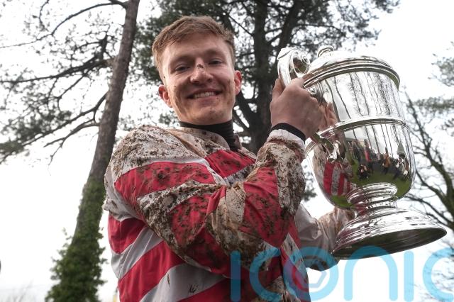 Jockey Eoin Staples celebrates following victory in the Goffs Thyestes Handicap Chase on Now Is The Hour (Brian Lawless/PA)