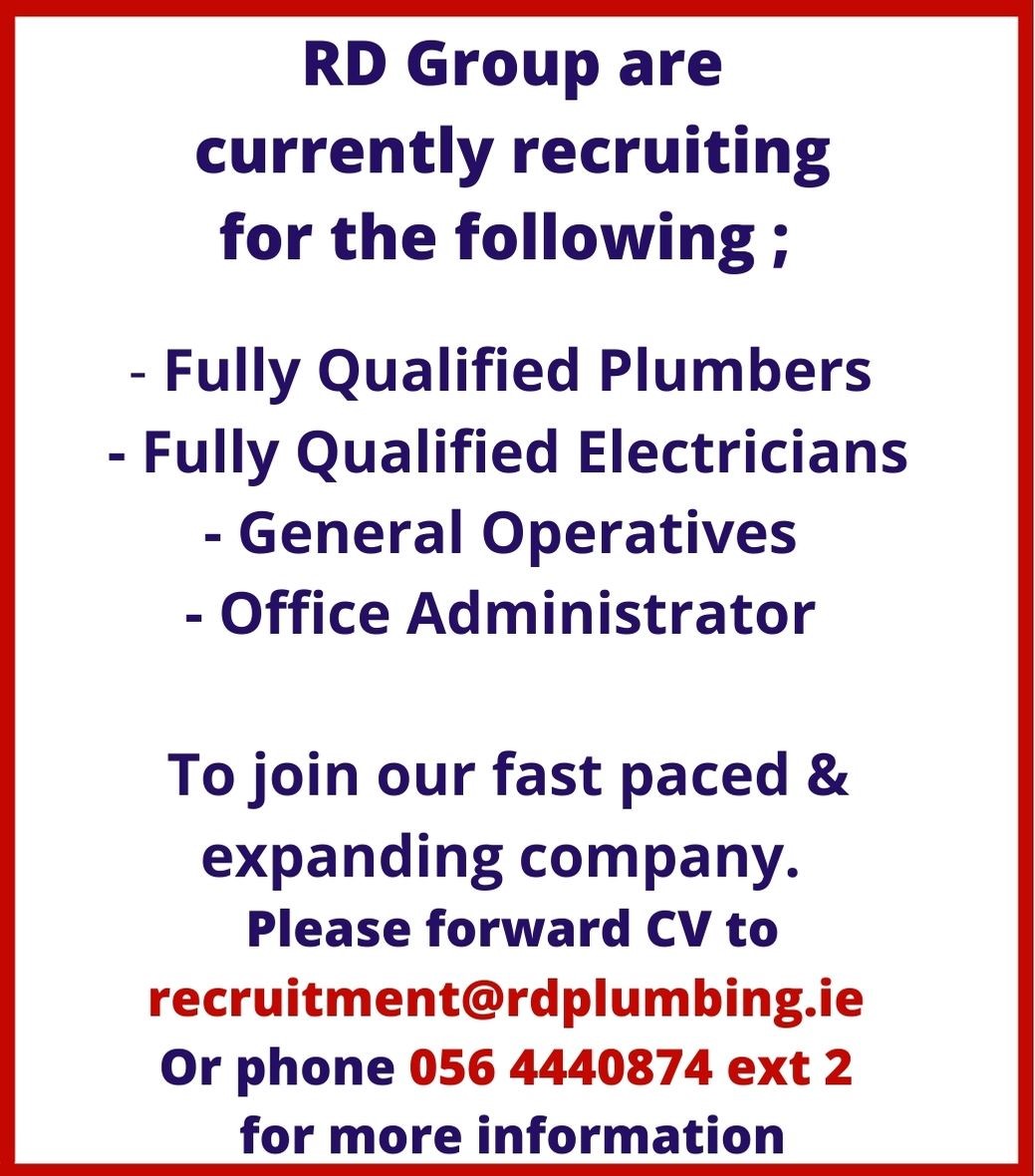 To join our fast paced & expanding company. Please forward CV to recruitment@rdplumbing.ie Or phone 056 4440874 ext 2 for more information