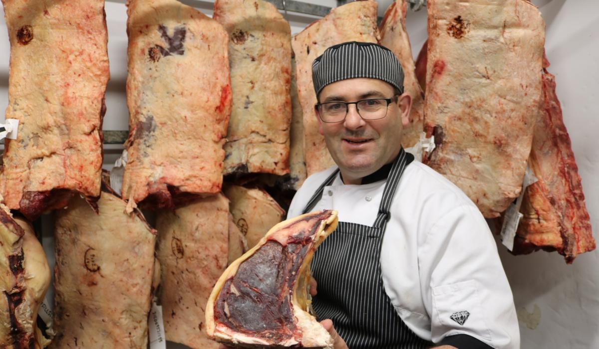 Master Butcher Derek Molloy, Ennis with his 3 Star Dry Aged T.Bone Steak
