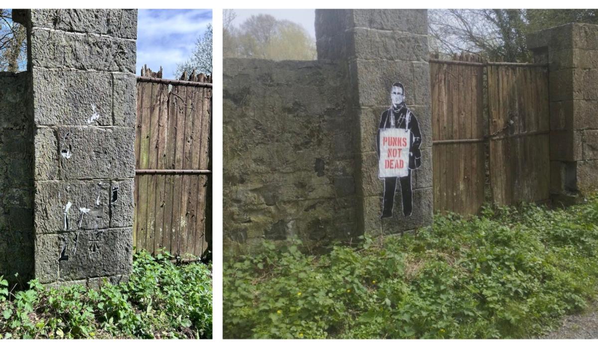The unusual wall piece materialised overnight - depicting the now well-known, divisive figure standing with his schoolbag as he has often done outside the gates of Wilson's Hospital. The solitary figure also bore a sandwich board with the message 'Punks [sic] not dead'.