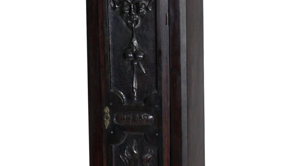The carvings on the clock indicate its significance with the devilish club as design features include brass dial Roman numerals by Charles Gillespy of Dublin along with a glazed door flanked by Corinthian columns. Over a shaped panel door the image of a demonic figure is depicted with fruit draped from its mouth. The clock is dated '1749' and other features linked the club include a carved burning flame with the panelled base depicting a hand which is holding cards, and crossed pikes on bracket feet.