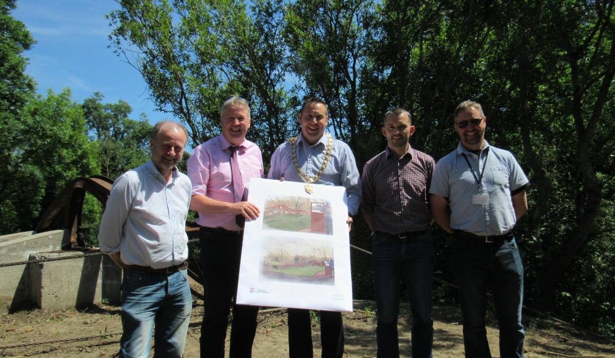At the launch of the interpretation design is Fred Morton (Asst Foreman), Simon Walton (Senior City Engineer), Mayor Peter Cleere, Declan Murphy (Area Engineer) and Paddy Kavanagh (Asst foreman)