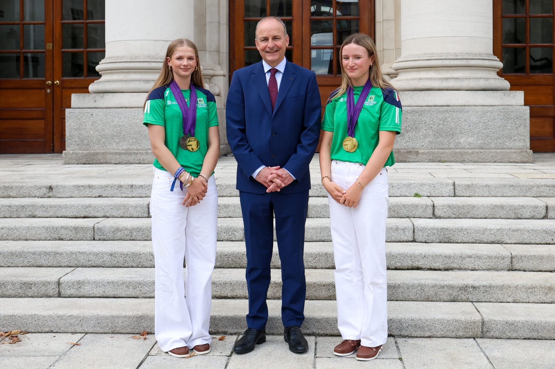 ABOVE: Ireland’s double medal winners Tabitha Kyle (L) and Emily Moloney (R) were welcomed by An Taoiseach Micheal Martin at Government Buildings. Photo: Rachel Lyons