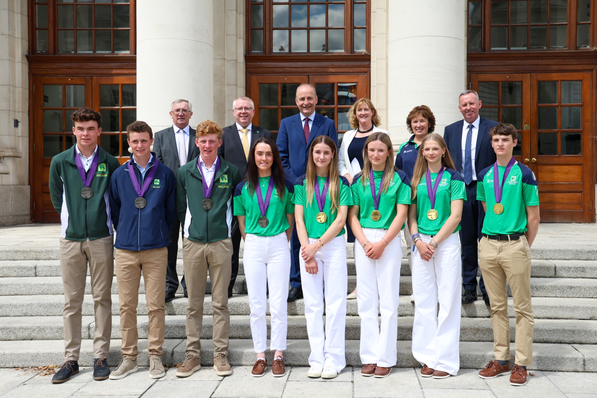 Ireland's medal-winning Junior (U-18) and Young Rider (U-21) teams and managers were welcomed by An Taoiseach Micheal Martin at Government Buildings. They were joined by Horse Sport Ireland CEO Denis Duggan and Sport Ireland CEO, Una May. Photo: Rachel Lyons