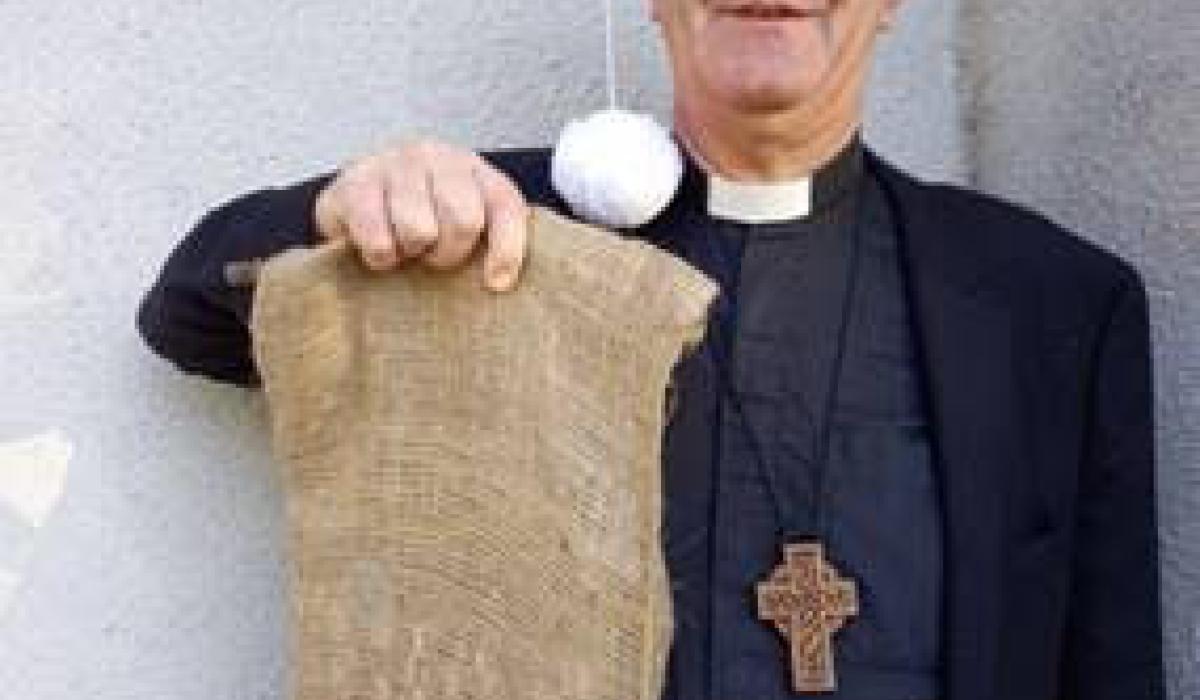 he Most Rev Michael Burrows, Bishop of Cashel, Ferns and Ossory holds up his Christmas sandbag stocking to raise awareness of the hunger crisis in flood-hit South Sudan