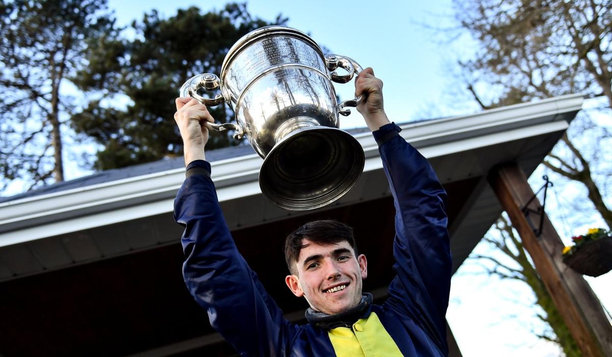 Jockey Darragh O'Keeffe with the trophy after riding Longhouse Poet to win the Goffs Thyestes Handicap Steeplechase at Gowran Park in Kilkenny. Photo by Harry Murphy/Sportsfile