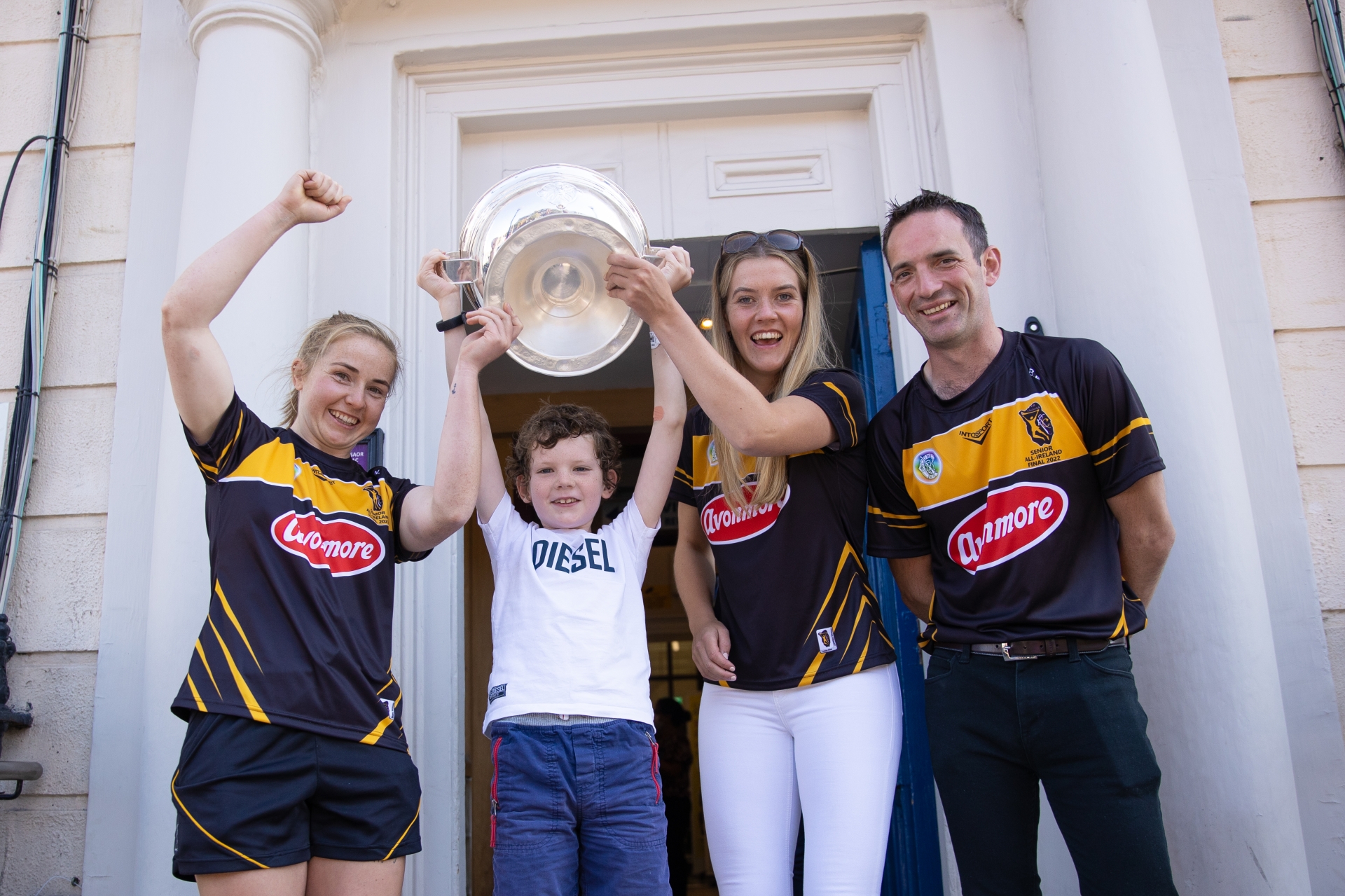 Fiachra, aged 9, holds the Sean O’Duffy Cup with Kilkenny’s Player of the Match Katie Power, Team Captain Aoife Prendergast and Manager Brian Dowling outside Temple Street Childrens Hospital ©INPHO/Ben Brady